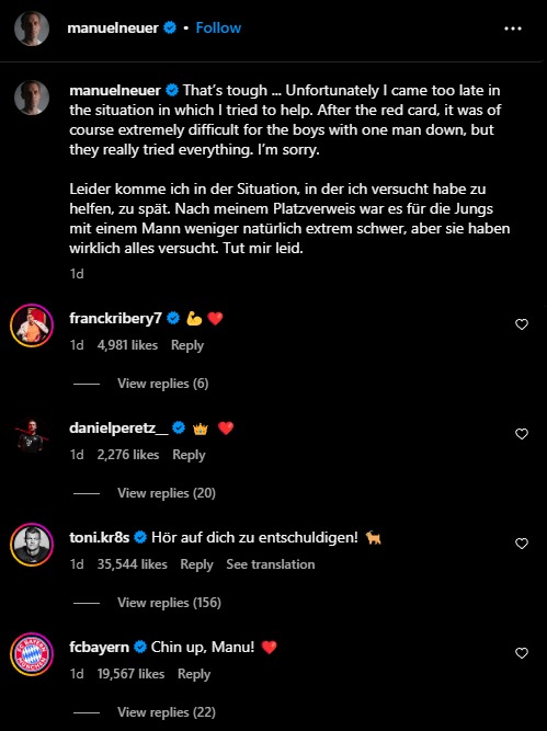 “That’s tough … Unfortunately I came too late in the situation in which I tried to help. After the red card, it was of course extremely difficult for the boys with one man down, but they really tried everything. I’m sorry,” Neuer wrote on Instagram.