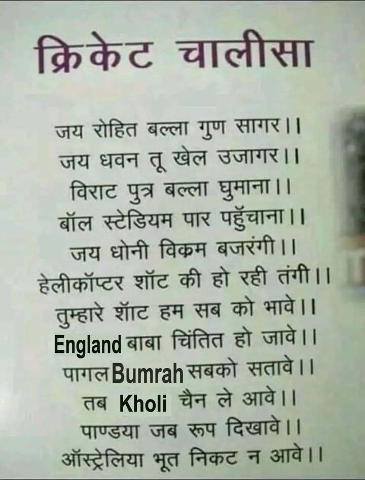 This Chalisa has been prepared with the players of the Indian team. In this Chalisa, along with the Indian players, the name of England and Australia team is also included. This includes players like Rohit Sharma, Virat Kohli, Shikhar Dhawan, MS Dhoni, Hardik Pandya and Jasprit Bumrah.